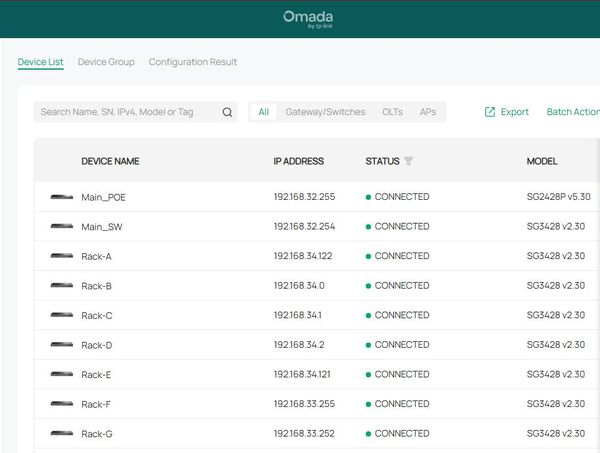 Omada 컨트롤러에서는 장비별 IP, 상태, 모델명을 한눈에 확인할 수 있어