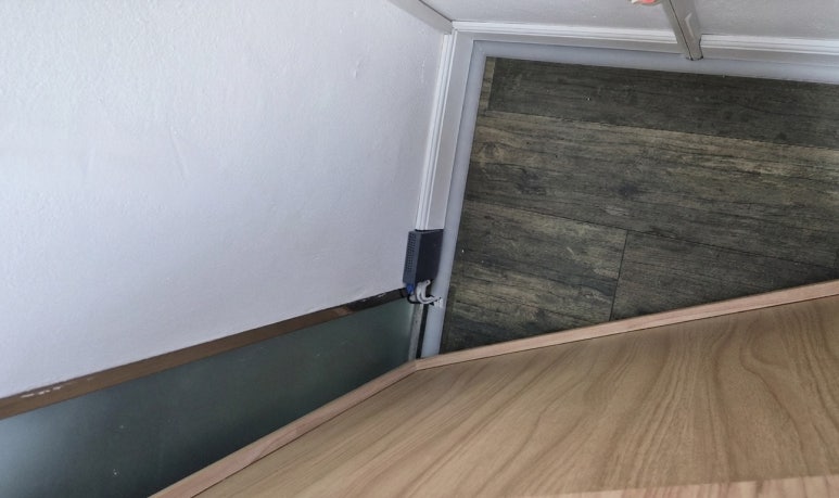 [벽면 콘센트 라인부터 바닥까지 이어지는 깔끔한 몰딩 처리]