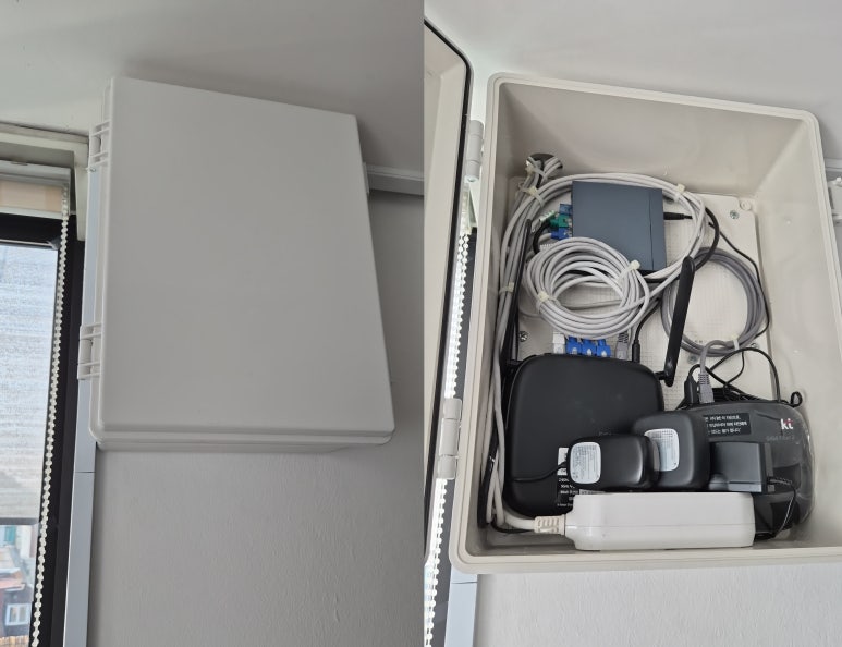 [창틀에 복잡하게 놓인 KT 인터넷 모뎀과 공유기]