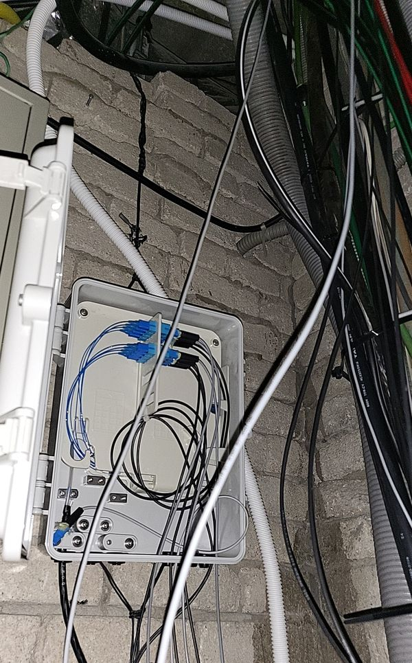 사진: 외부에서 인입된 광케이블을 보호하고 분기하는 광분배함(OFD/FDF) 내부 모습. 곡률 반경을 유지하며 깔끔하게 권취된 모습이 인상적입니다.