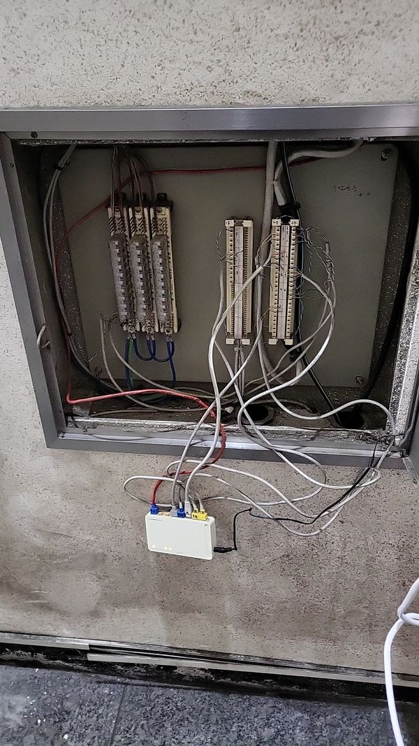 사진(미흡): 구형 110블록 단자대와 소형 스위치가 별도 고정 없이 매달려 있는 모습입니다. 이는 물리적 단선이나 접촉 불량의 원인이 됩니다.