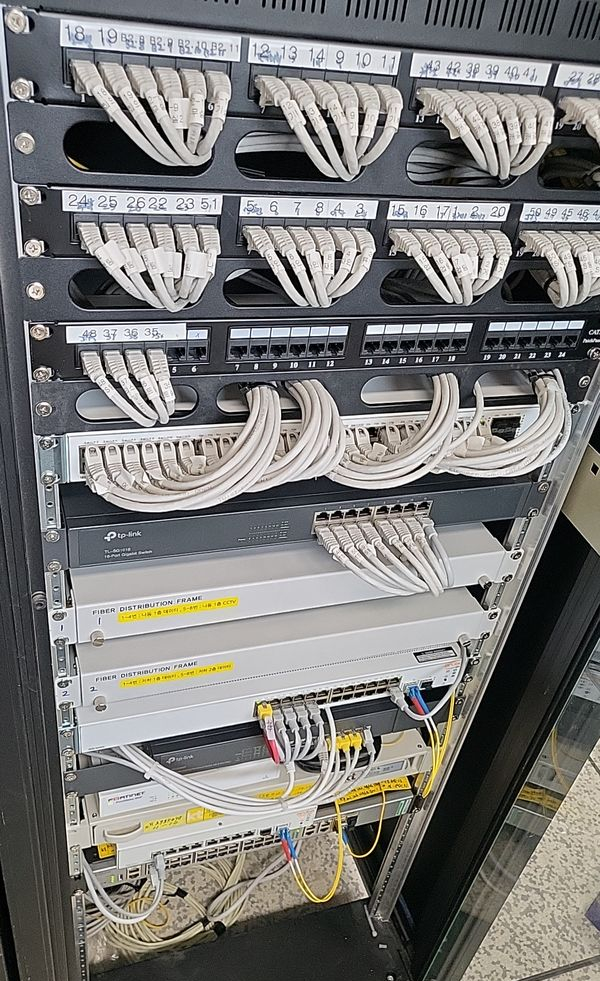 체계적인 패치 판넬 사용: 상단에 번호가 매겨진 패치 판넬을 배치하여 각 사무 공간으로 뻗어 나가는 라인을 한눈에 파악할 수 있도록 했습니다.
