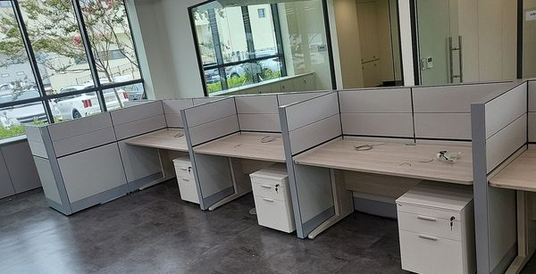 깔끔한 레이아웃: 사무실 인테리어를 해치지 않는 그레이/화이트 톤의 마감